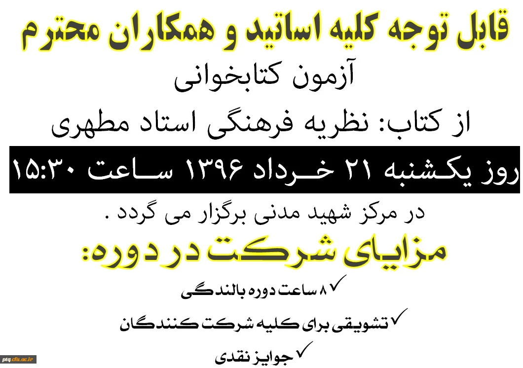 امتیاز دهید : اطلاعیه مسابقه کتابخوانی ویژه اساتید و همکاران محترم یکشنبه 31 اردیبهشت 1396 ساعت 12:36