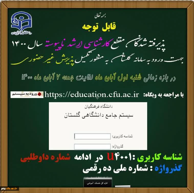 امتیاز دهید : قابل توجه پذیرفته شدگان مقطع کارشناسی ارشد ناپیوسته سال 1400 2 دوشنبه 3 آبان 1400 ساعت 6:12