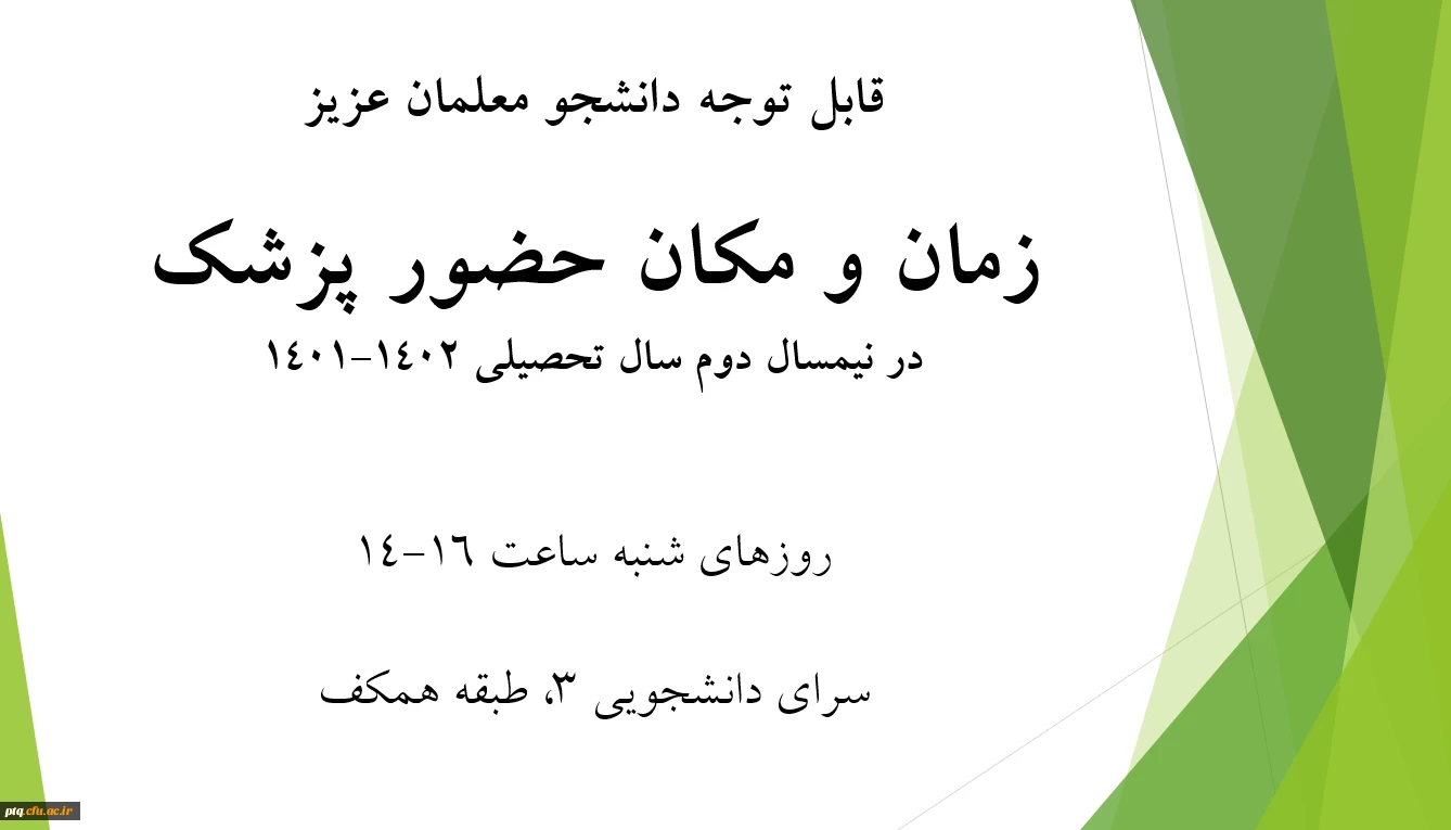 امتیاز دهید : تغییر زمان حضور پزشک پردیس در نیمسال دوم سال تحصیلی 1402-1401 2 شنبه 6 اسفند 1401 ساعت 11:45